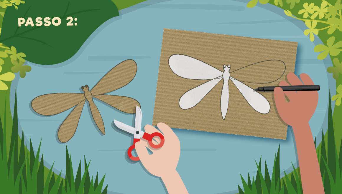 Para começar, desenha uma libelinha numa folha de papel e recorta-a.