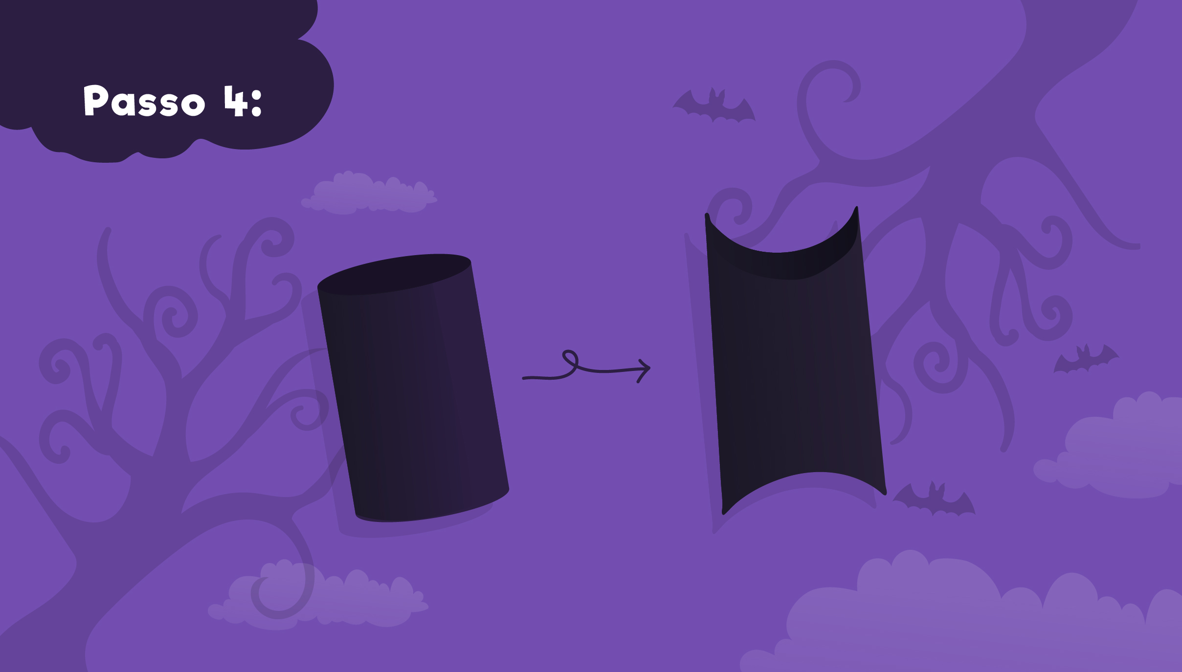 Dobra uma das extremidades do tubo de cartão em forma de sorriso e, depois, fecha a outra com o mesmo tipo de dobra. Assim, consegues dar forma às orelhas e patas do teu morcego.