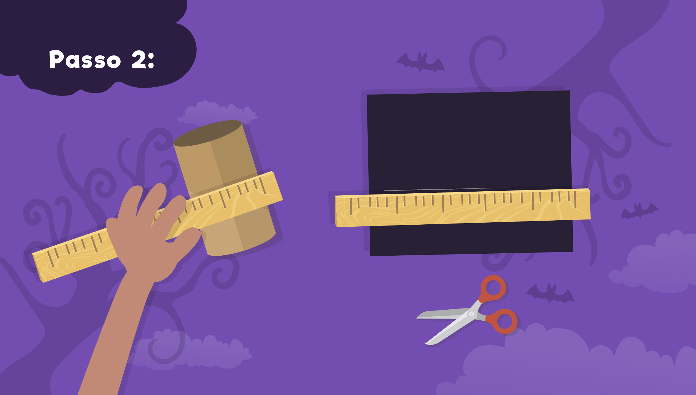 Mede a altura e a largura do tubo de cartão do rolo de papel higiênico. Desenha um retângulo com essa medida no restante papel preto. Recorta o retângulo.