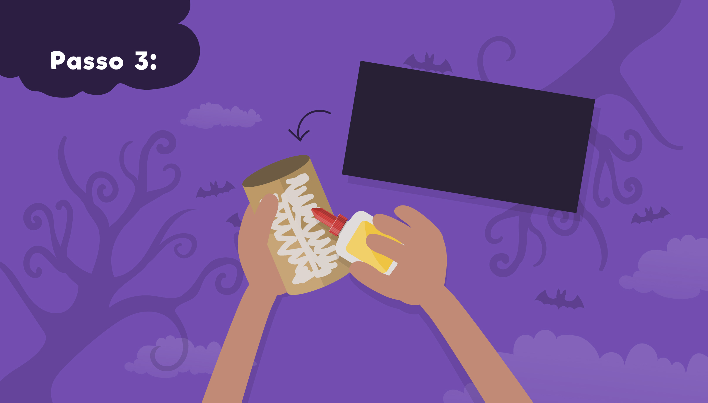 Cobre o tubo de cartão do rolo de papel higiénico com cola e reveste-o com o retângulo de papel preto que recortaste.
