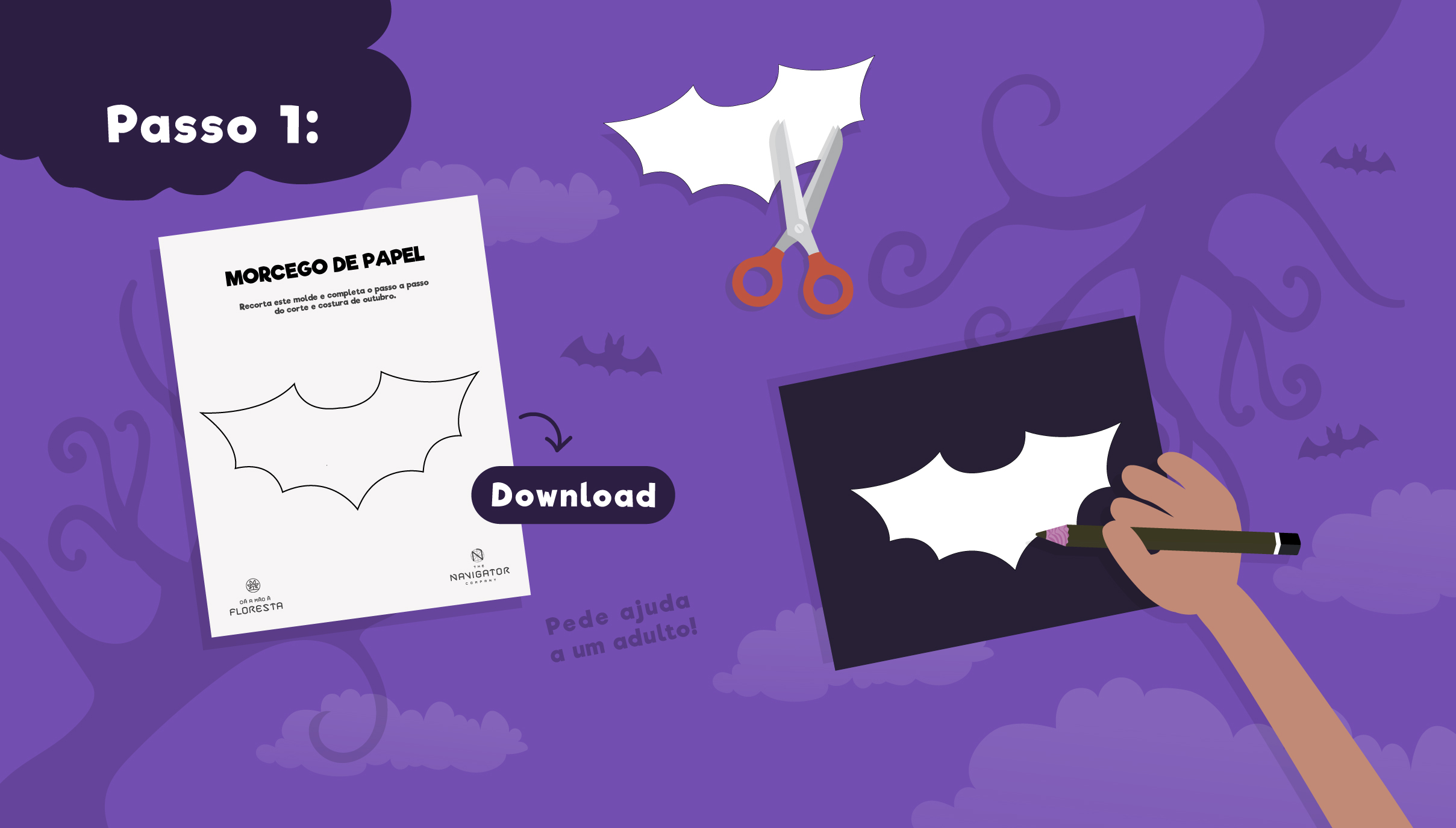 Faz o download do nosso molde de asas de morcego e imprime numa folha de papel comum. Em seguida, se precisares, pede ajuda a um adulto para recortar o molde impresso com a tesoura. Depois, usa o lápis para fazer o contorno das asas no papel preto e volta a recortar.