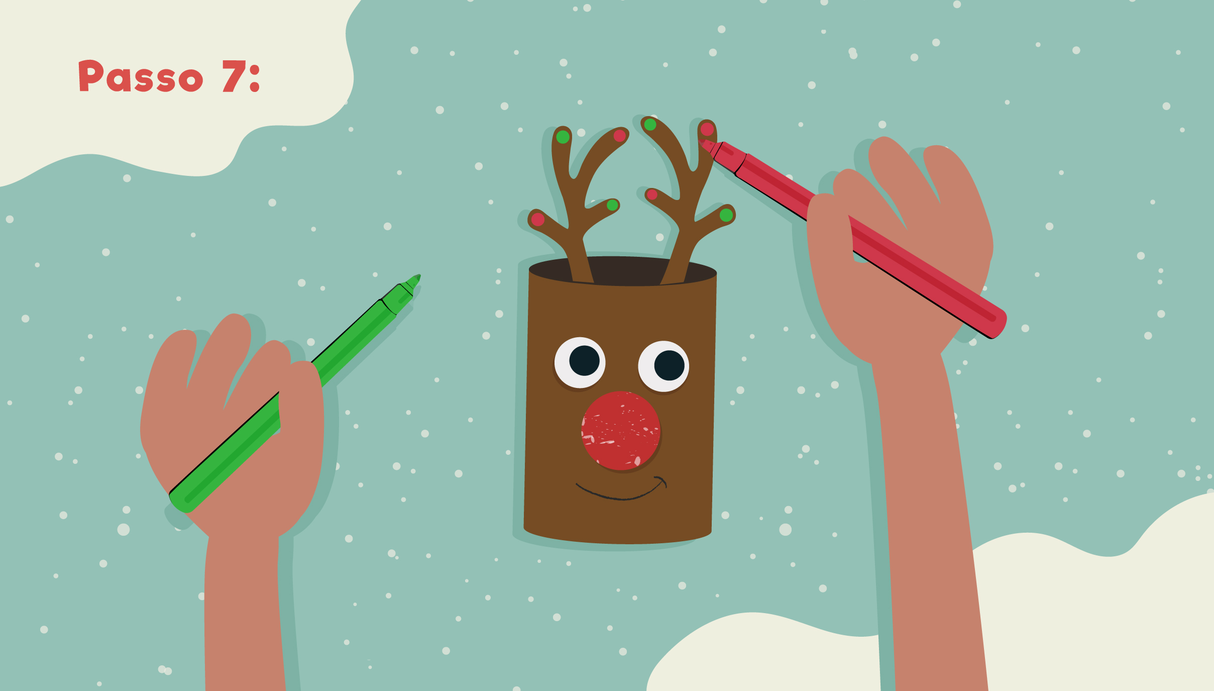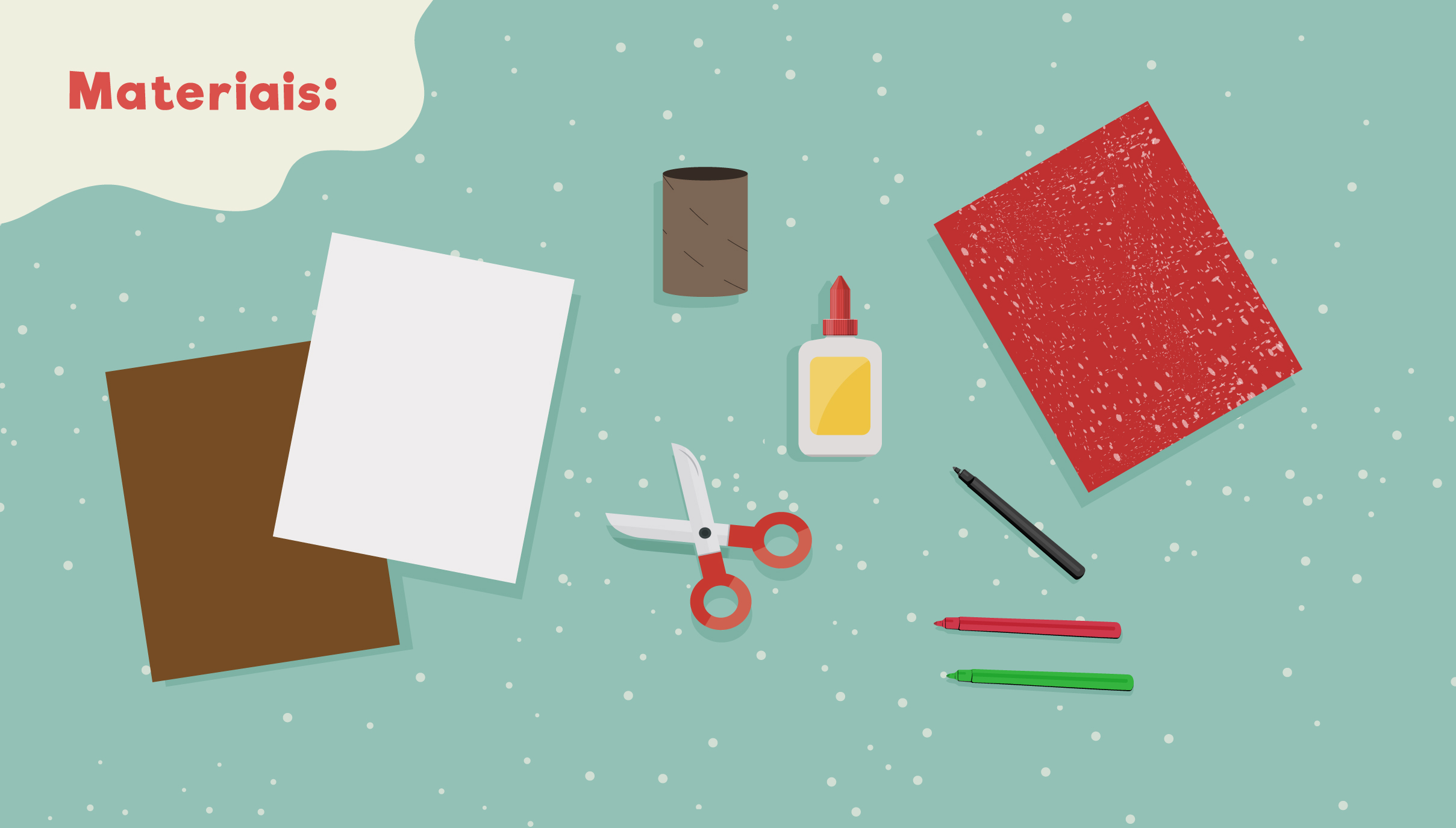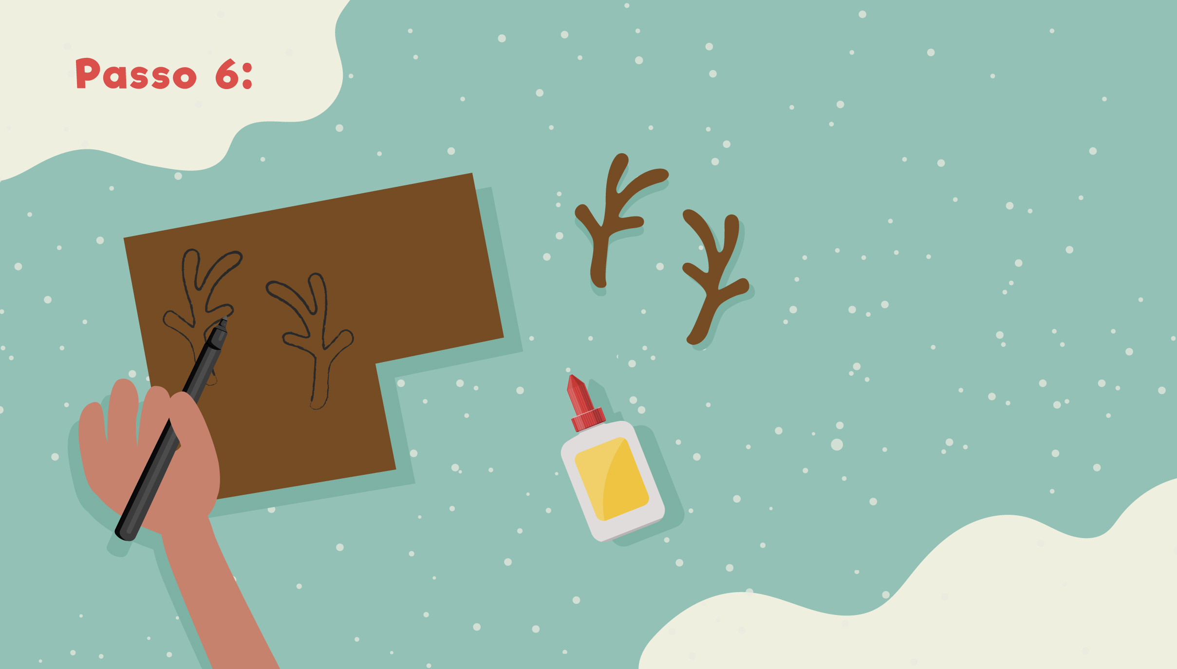Entretanto, na restante cartolina castanha, desenha duas hastes de rena e recorta-as. Pede a ajuda de um adulto. Em seguida, cola-as na parte superior e interior do rolo de papel, por cima dos olhos.
