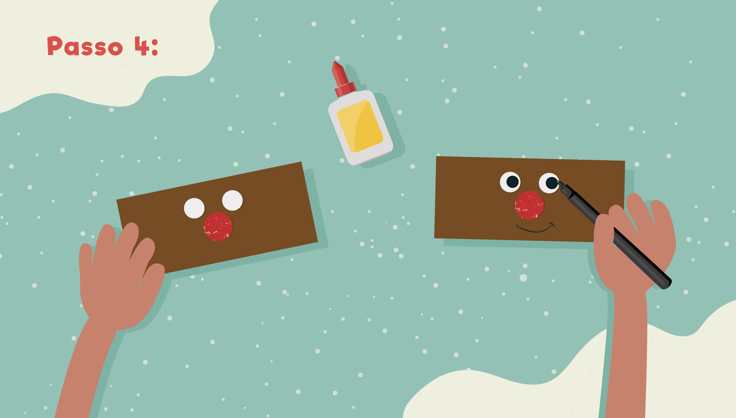 Cola os olhos e o nariz da rena no centro do retângulo castanho. Desenha a boca e os detalhes dos olhos com uma caneta preta,por baixo do nariz.