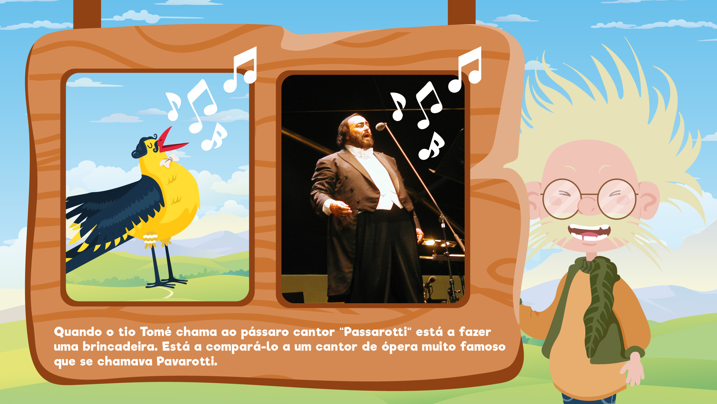 Quando o tio Tomé chama ao pássaro cantor “Passarotti” está a fazer uma brincadeira. Está a compará-lo a um cantor de ópera muito famoso que se chamava Luciano Pavarotti.