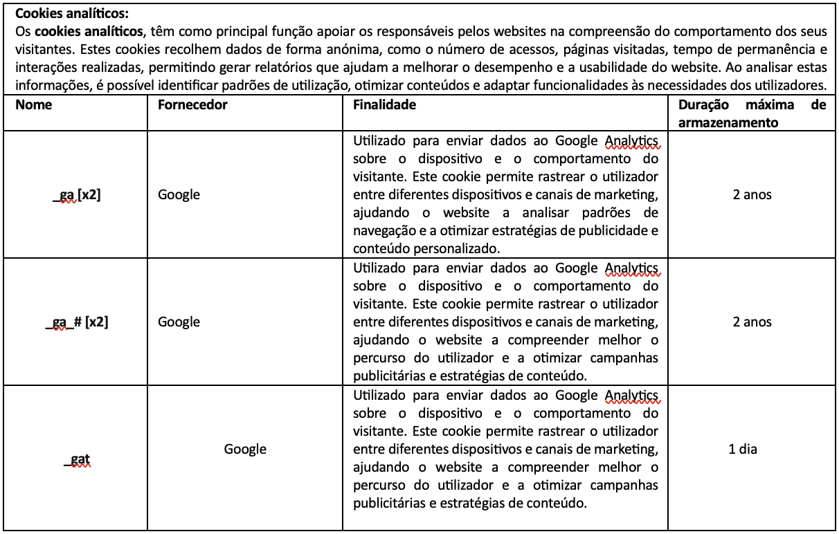 Os cookies utilizados no website e na área reservada do website têm como objetivo melhorar a experiência de navegação dos utilizadores, garantir o funcionamento adequado dos websites e otimizar os serviços prestados. Para isso, são empregues diferentes tipos de cookies, nomeadamente: cookies estritamente necessários, que asseguram funcionalidades essenciais e preferências básicas; cookies analíticos, que recolhem dados estatísticos para análise de desempenho e utilização; cookies de personalização, que adaptam a navegação às preferências individuais; e cookies de publicidade, que permitem apresentar anúncios mais relevantes com base nos interesses do utilizador.