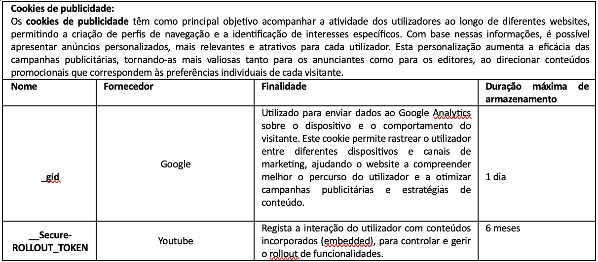 - Cookies de publicidade: têm como objetivo tornar os anúncios mais relevantes e atrativos, com base nos interesses do utilizador. Permitem otimizar campanhas publicitárias, evitando a repetição de anúncios já visualizados ou considerados irrelevantes. Estes cookies são geralmente persistentes e podem igualmente transferir dados para fora do EEE.