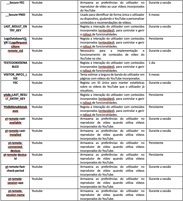 Importa referir que nem todos os canais digitais da Navigator recorrem a todas estas categorias de cookies. Para conhecer em detalhe a classificação, finalidade, duração e entidade responsável por cada tipo de cookie, recomenda-se a consulta da informação disponível das tabelas abaixo: