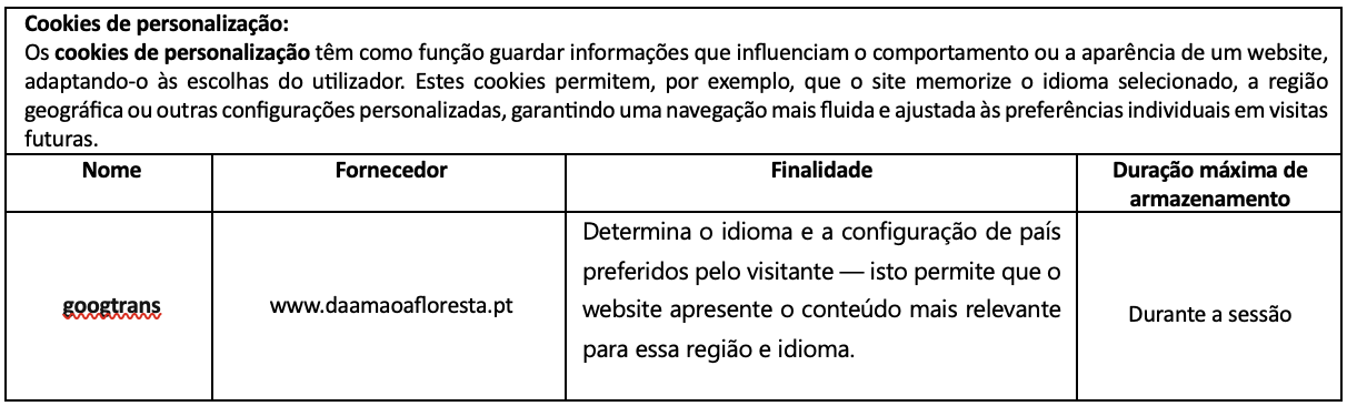 - Cookies de personalização: também não essenciais, são utilizados para adaptar a navegação às preferências individuais do utilizador, contribuindo para uma experiência mais fluida e personalizada. Tal como os anteriores, podem implicar a transferência de dados para fora do EEE.