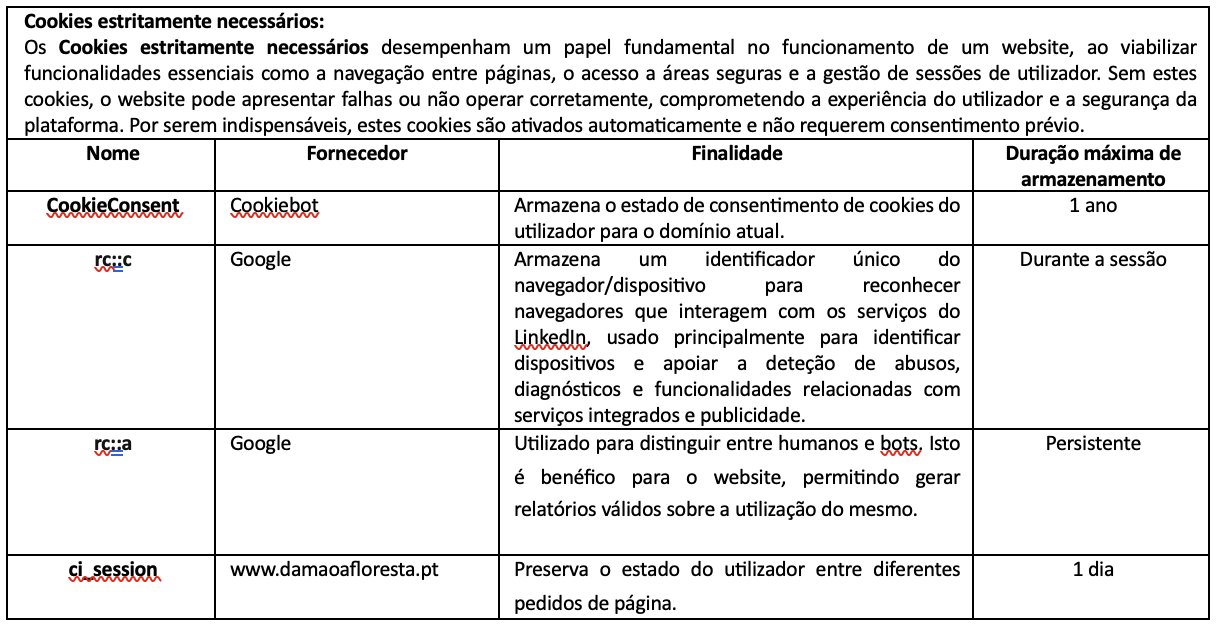 - Cookies estritamente necessários: essenciais para garantir o funcionamento adequado do website e para disponibilizar funcionalidades solicitadas pelo utilizador. Estes cookies também permitem guardar preferências de navegação, como o idioma ou o tipo de dispositivo utilizado, sempre que o utilizador assim o deseje;