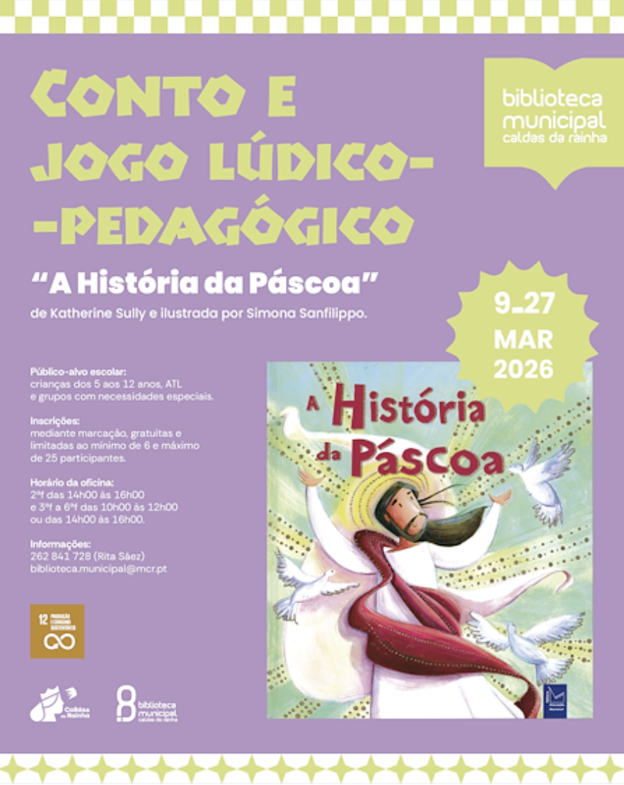 A Biblioteca Municipal organiza o “Conto e jogo lúdico?pedagógico: A História da Páscoa”, baseado no livro de Katherine Sully. Primeiro, as crianças ouvem a história da Páscoa e, depois, participam num jogo da Páscoa que ajuda a consolidar a mensagem de forma divertida.